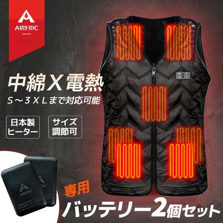 AIRFRIC バッテリー付き 2個セット 電熱ベスト 大きいサイズ 中綿入り ウエスト調整可 ヒートベスト 遠赤外線加熱 ヒーター内蔵 モバイルバッテリー対応 袖なし 3段温度調節 7つヒーター 即暖 防寒 水洗い可 スキー スケート 登山 釣り アウトドア 丸洗いOK 軽量 hs20-2bt