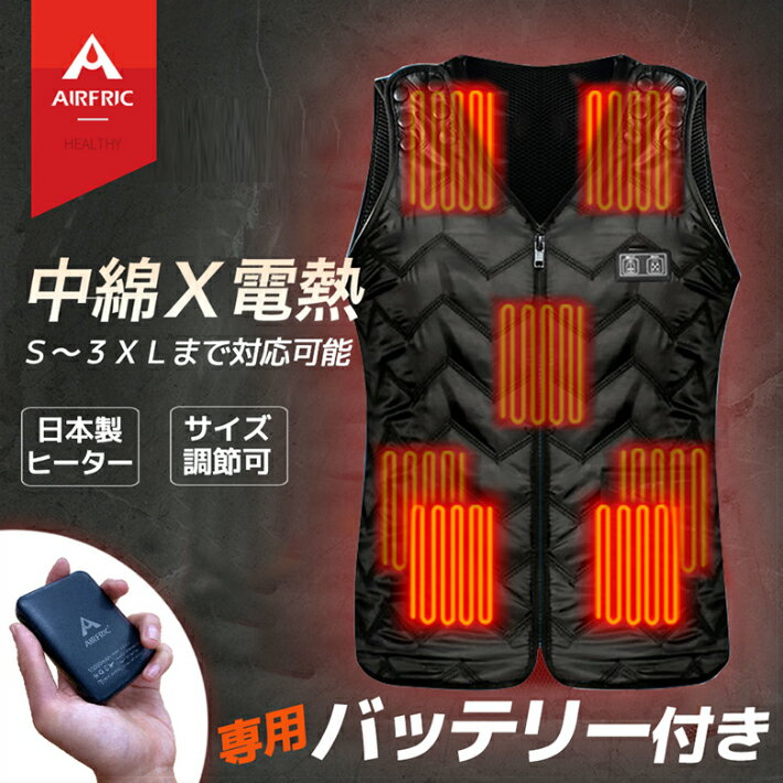 2021年新型 AIRFRIC バッテリー付き 電熱ベスト 大きいサイズ 中綿入り ウエスト調整可 ヒートベスト 遠赤外線加熱 ヒーター内蔵 モバイルバッテリー対応 袖なし 3段温度調節 7つヒーター 即暖 防寒 水洗い可 スキー スケート 登山 釣り アウトドア 丸洗いOK 軽量 hs20-bt